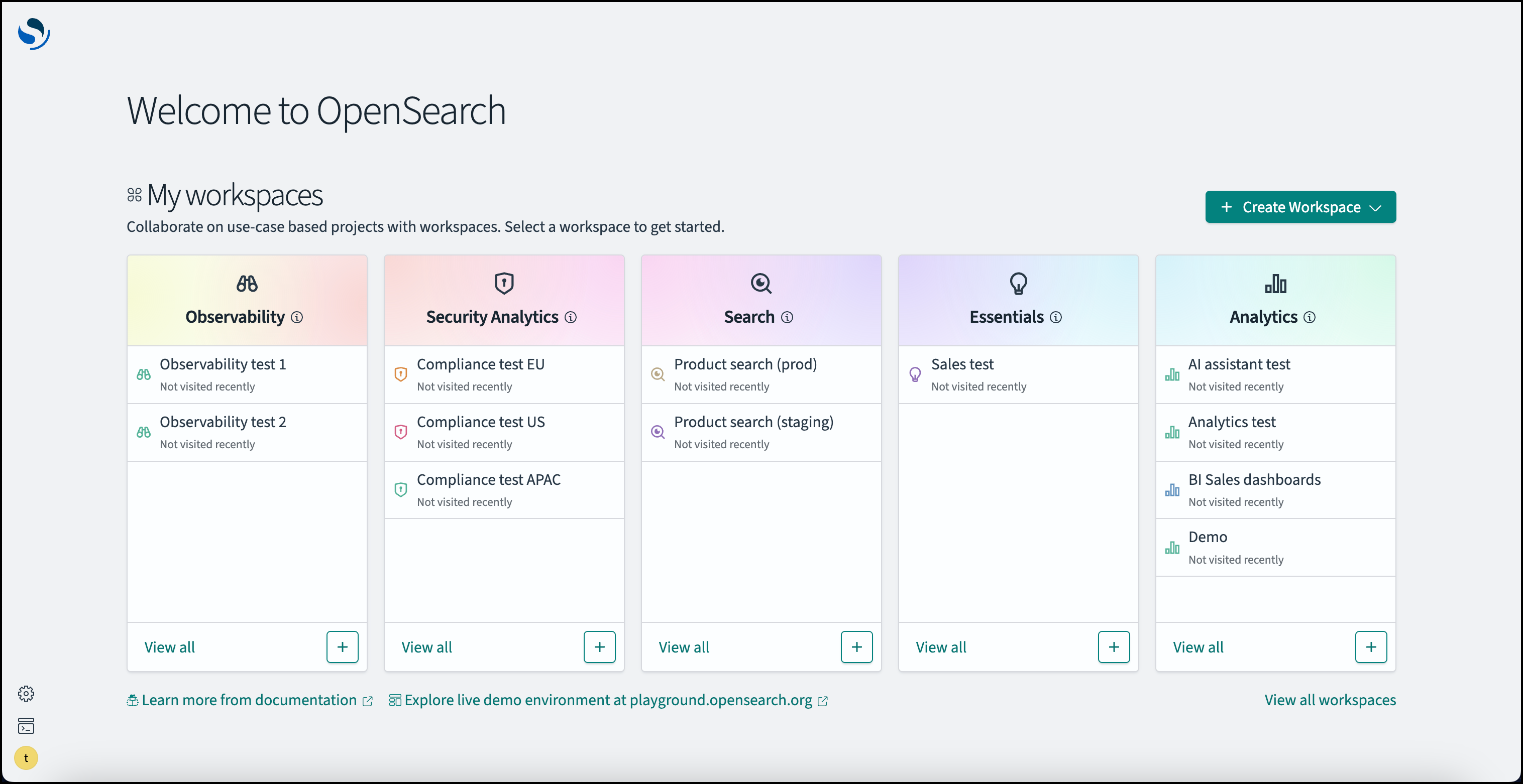 If you want to start, I go to my user interface OpenSearch and log in. From the home page I choose the workspace for Amazon Q Developer testing in OpenSearch Service. For this demonstration I use a preconfigured environment with a data set of samples available on the user interface.