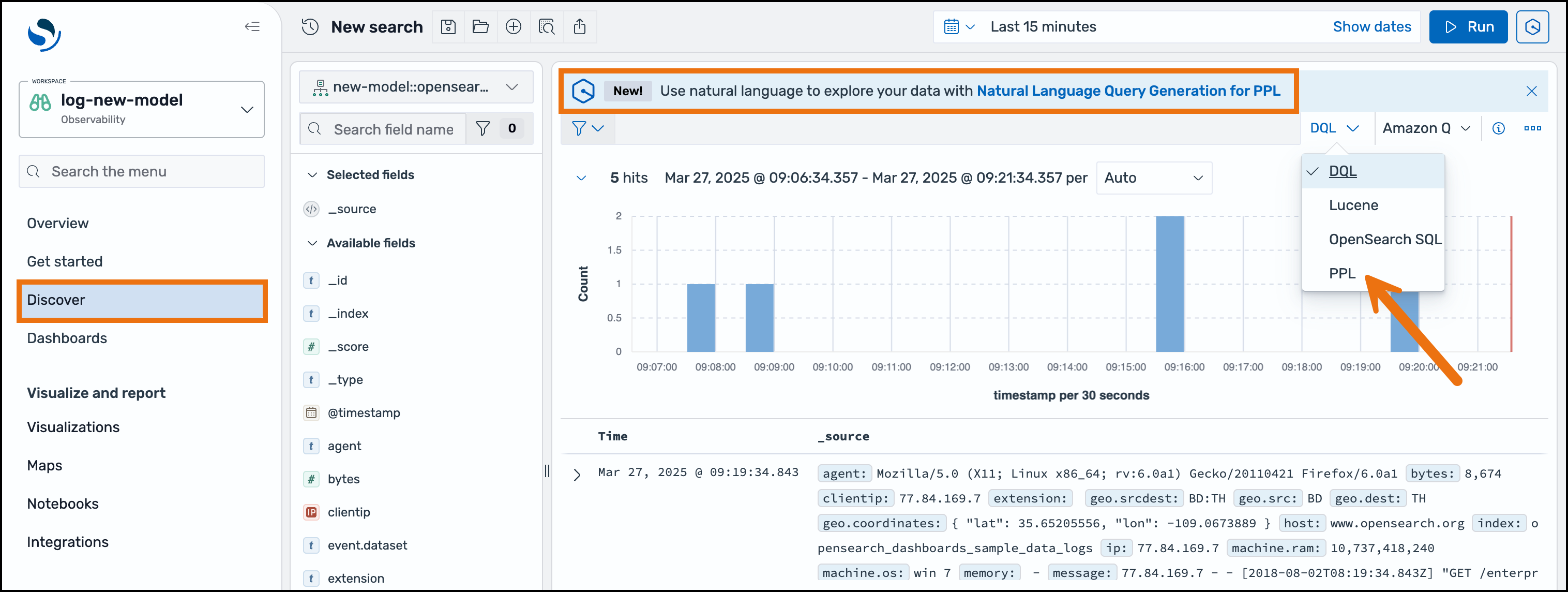 In OpenSearch Dashboards I’m navigating Discovers From the left navigation pane. You want to use a natural language to explore data, switch Ppl Language to display the challenge.