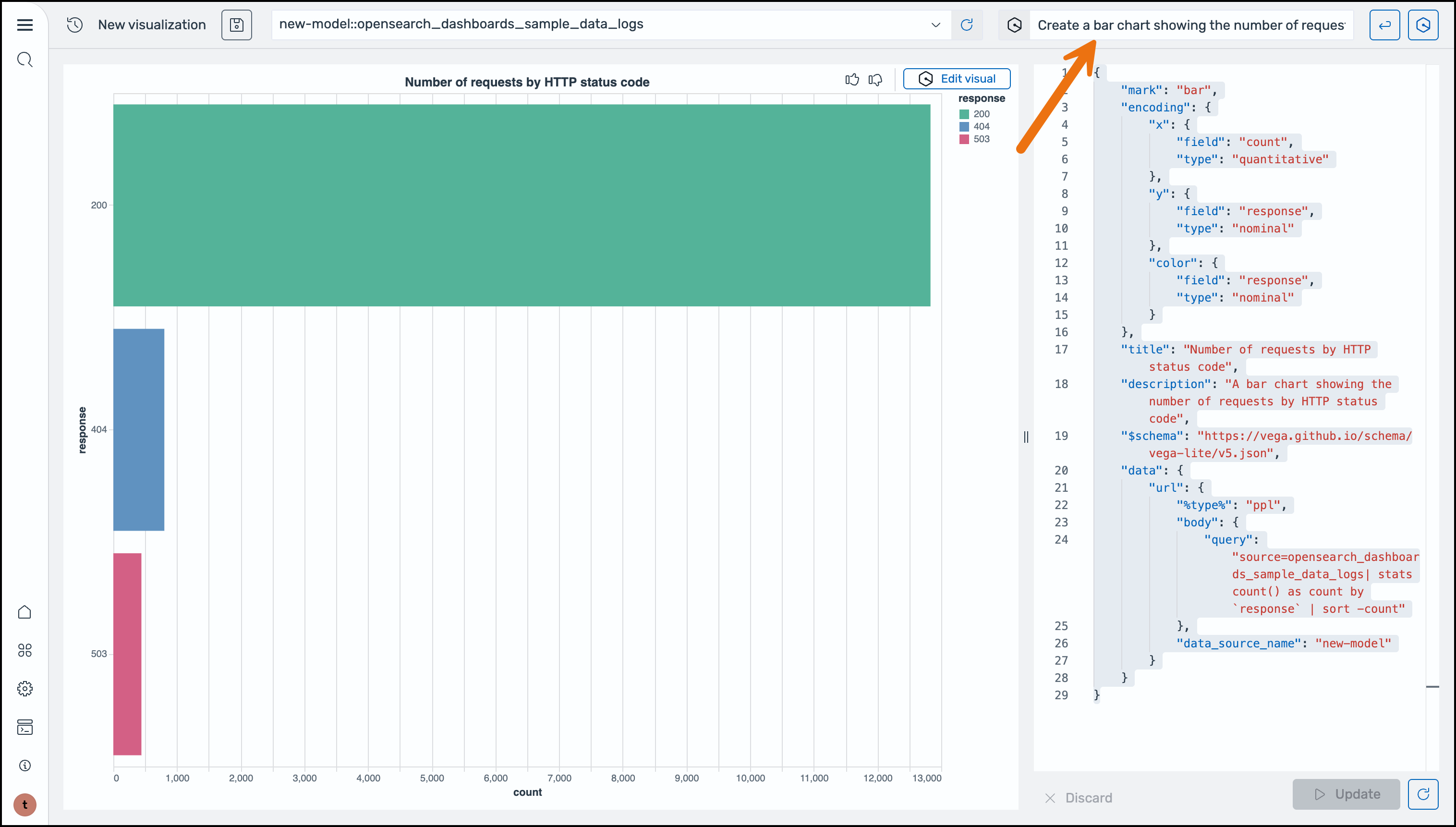 Let’s look at the visualization of Howrate directly from the descriptions of the natural language. I choose Generate visualization from Amazon Q panel. I will enter Create a bar chart showing the number of requests by HTTP status code In the input field and choose to generate.